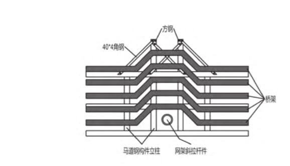 8)When the cable-stayed rods of the cable-stayed bridge frame and the cable-stayed space frame conflict, resulting in insufficient installation space for the bridge frame, the square steel that matches the cross-sectional size of the column should be used for full butt welding on the steel frame column where the bridge frame is installed, and the welds are fully welded , no meat biting phenomenon, brush anti-corrosion paint treatment, use two 40*4 angle steel to pull the square steel on both sides to make a stable support, the angle steel and square steel, and the railing of the horseway are fixed firmly with self-tapping screws. Supports and hangers are installed before and after the bridge is turned over (see Figure 3)